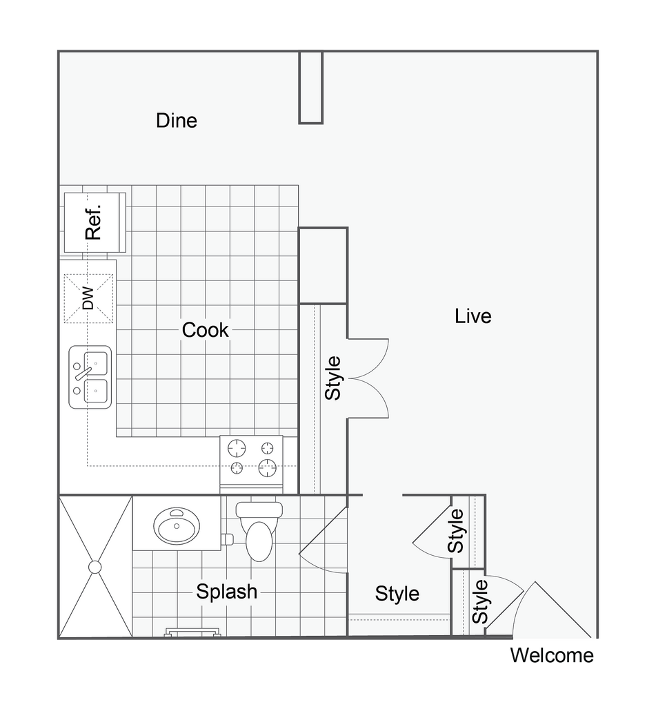 Modelo de apartamento: Van Buren$1,1501 Dormitorio, 1 Baño, 581 sq ftDisponible Ahora![]()