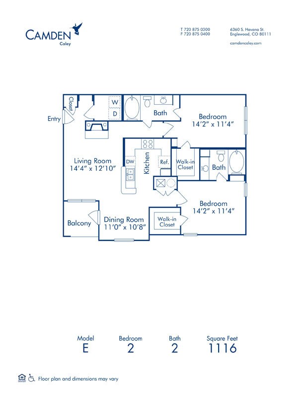 Modelo de apartamento: E2 Dormitorios, 2 Baños, 1116 sq ftNo DisponibleE - Plano 1 Plano: H