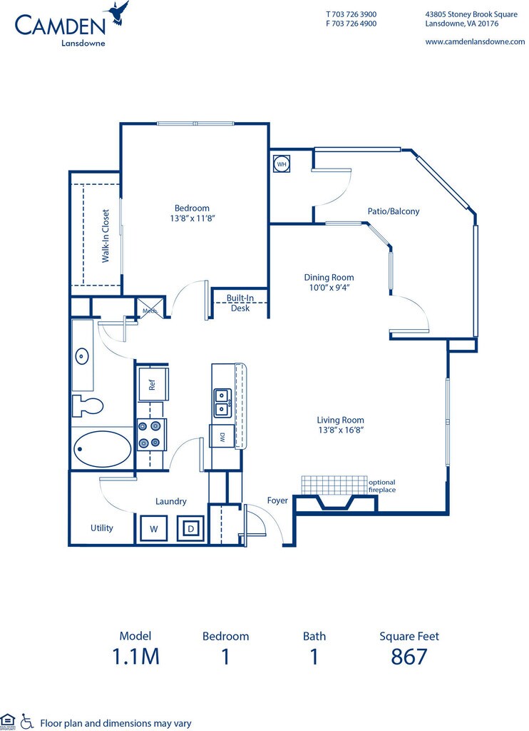 Modelo de apartamento: 1.1M1 Dormitorio, 1 Baño, 867 sq ftNo Disponible![]()
