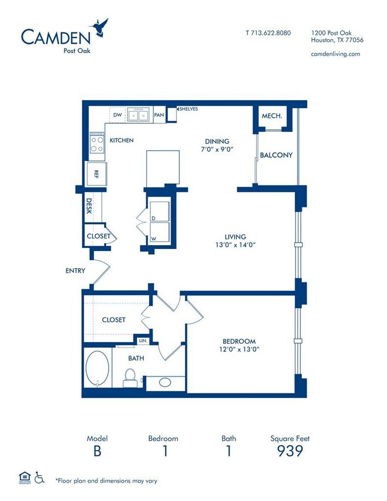 Modelo de apartamento: B1 Dormitorio, 1 Baño, 939 sq ftNo Disponible![]()