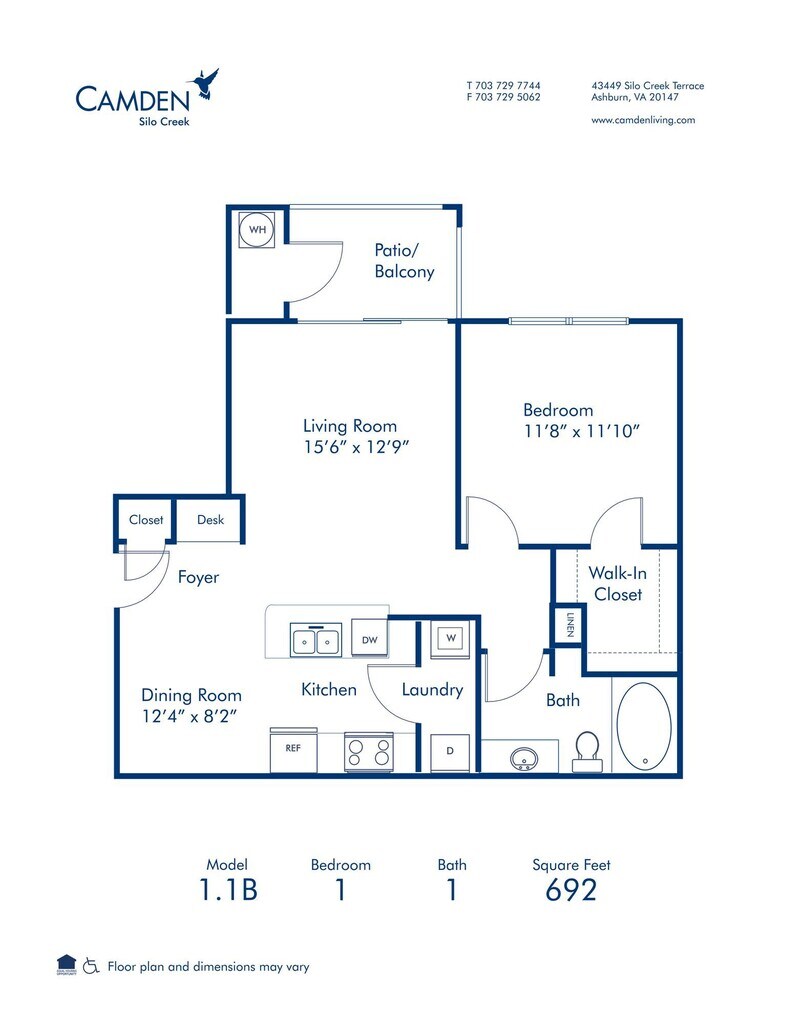 Modelo de apartamento: 1.1B1 Dormitorio, 1 Baño, 692 sq ftNo Disponible![]()