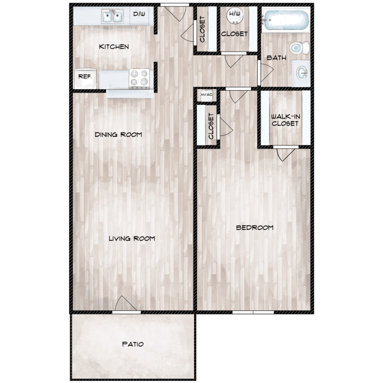 Modelo de apartamento: Chloe w/patio1 Dormitorio, 1 Baño, 777 sq ftDisponible December 3, 2025![]()