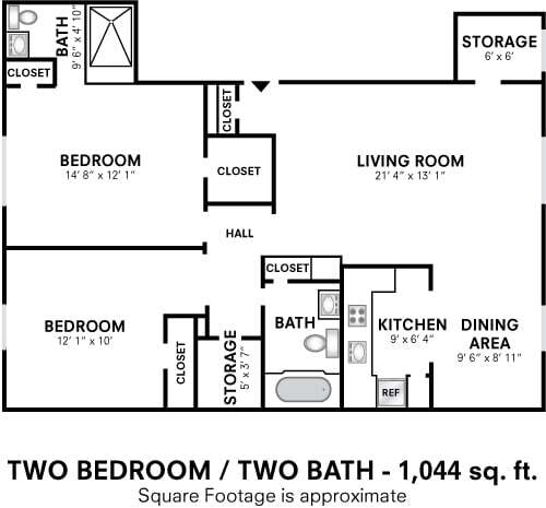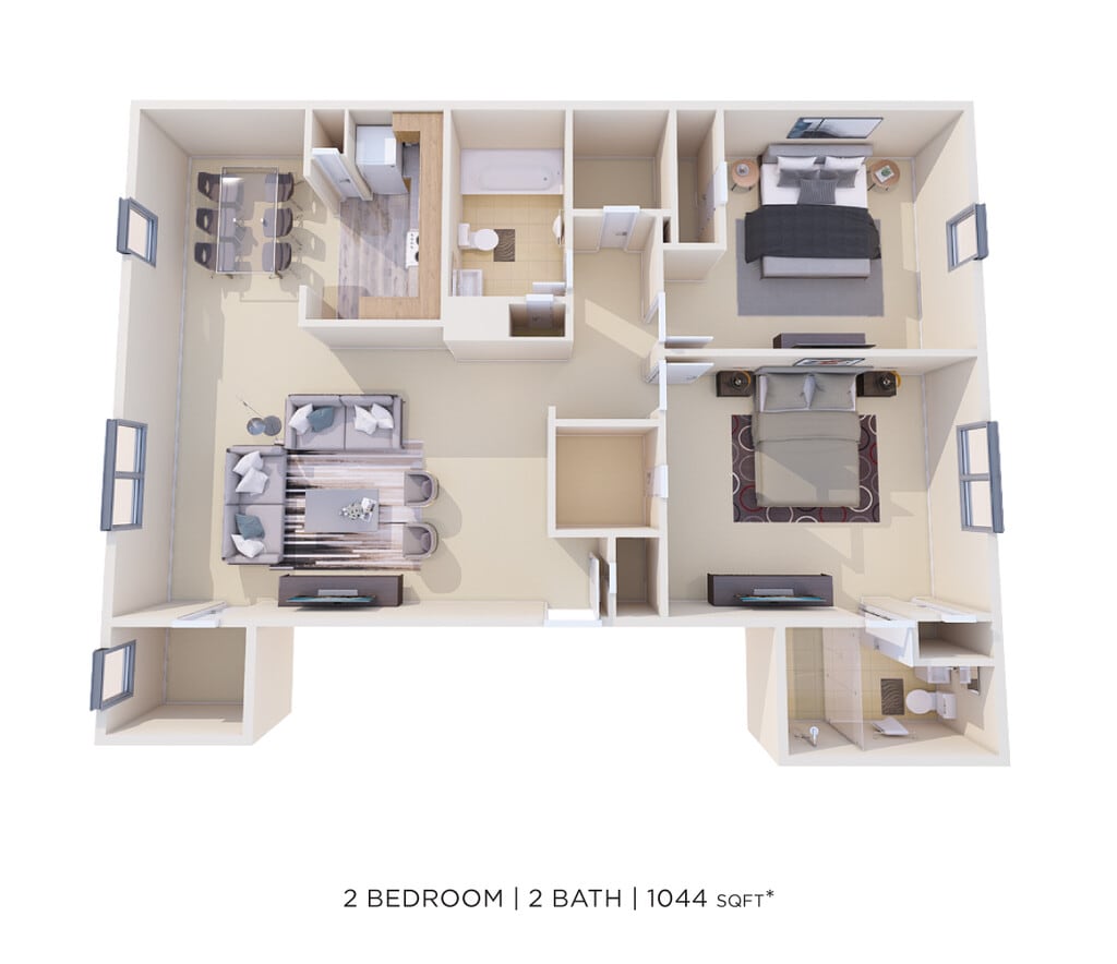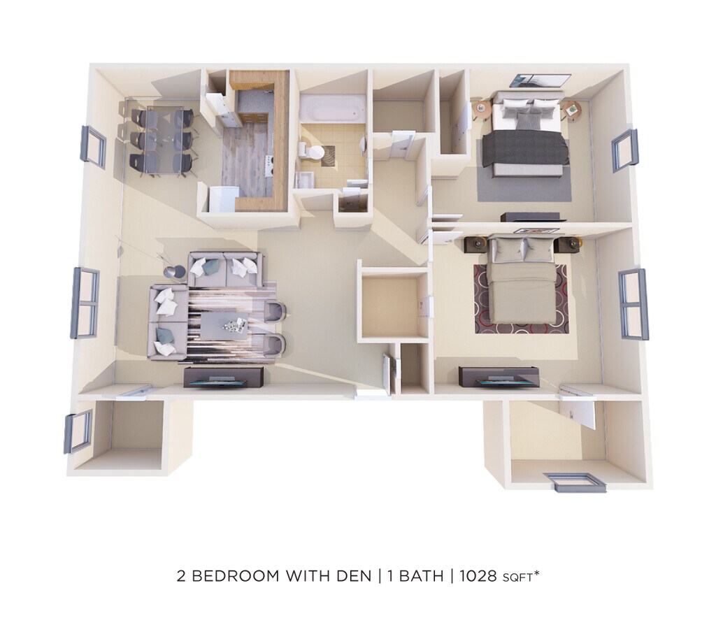 Modelo de apartamento: Two Bedroom - 954 sqftDesde $1,3302 Dormitorios, 1 Baño, 954-970 sq ftDisponible Ahora![]()