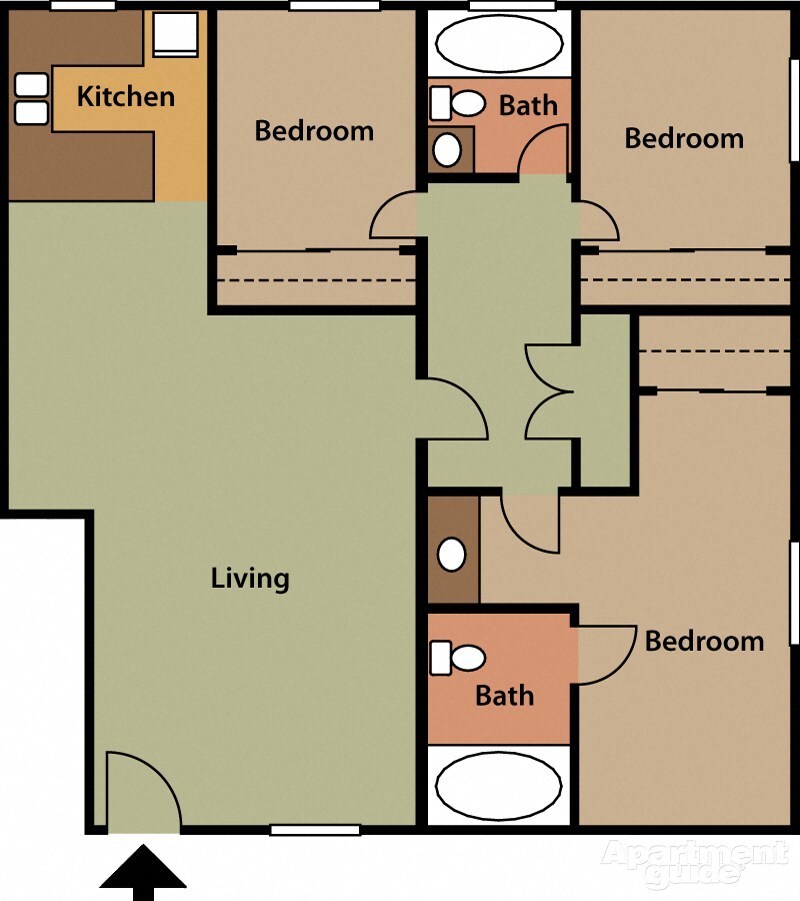 Modelo de apartamento: 3 Bedroom 2 BathLlame para Precios3 Dormitorios, 2 Baños, 1100 sq ftNo Disponible3 Bedroom 2 Bath - Plano 1 3 Bedroom 2 Bath - Plano 2