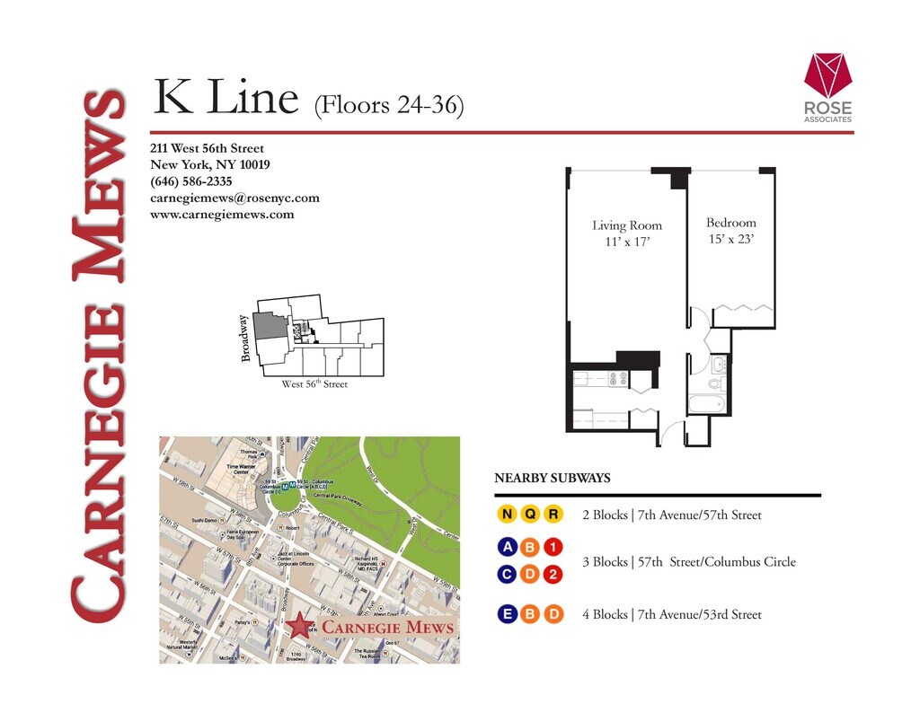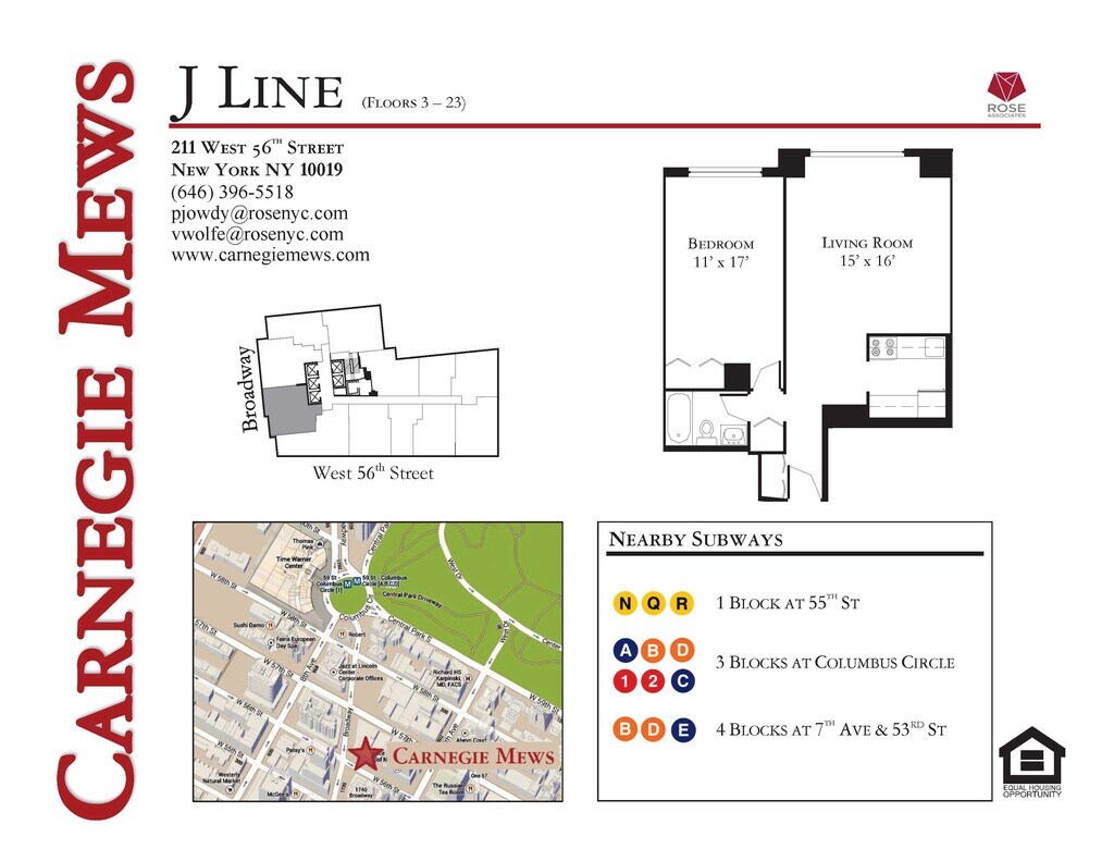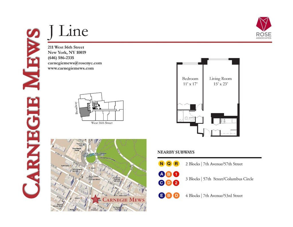 Ubicado en 211 West 56th Street, Carnegie Mews se encuentra en el centro del principal vecindario de Nueva York para el entretenimiento y las artes, a sólo pasos de Carnegie Hall, Lincoln Center, el distrito de teatros y Central Park. La torre de 36 pisos está compuesta por 396 unidades en configuraciones tipo estudio y de un dormitorio con amplias salas de estar, ventanas amplias y cocinas bellamente decoradas con electrodomésticos completos. El edificio cuenta con servicio de conserjería las 24 horas, servicios de tintorería, lavandería y garaje. Las calificaciones incluyen: 40X el alquiler mensual en ingresos anuales 80 veces el alquiler mensual para garantes (solo triestado) Sin paredes flexibles Sin mascotas, excepción para animales de servicio