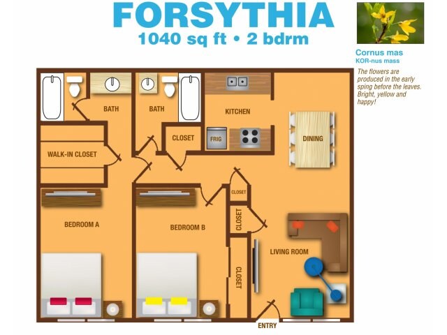Forsythia - Plano 1 Unidad de apartamento: S1Modelo de apartamento: ForsythiaDesde $9802 Dormitorios, 2 Baños, 1040 sq ftDisponible March 9, 2026