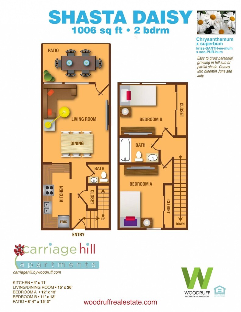 Modelo de apartamento: Shasta DaisyDesde $9102 Dormitorios, 1.5 Baños, 1006 sq ftDisponible February 28, 2026![]()