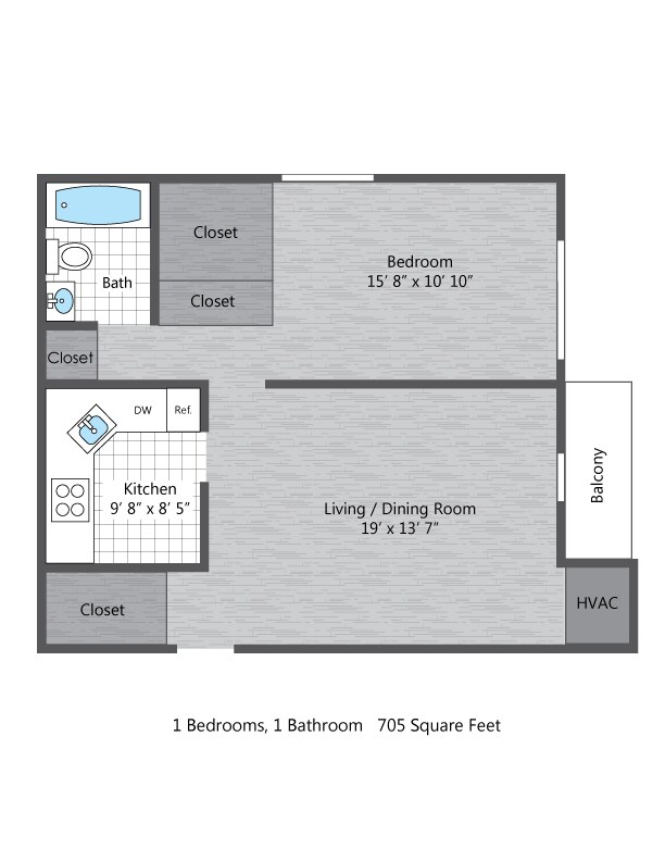 1BR/1BA - Plano 1 Unidad de apartamento: 1BModelo de apartamento: 1BR/1BA$2,1951 Dormitorio, 1 Baño, 705 sq ftDisponible Ahora2 Dormitorios