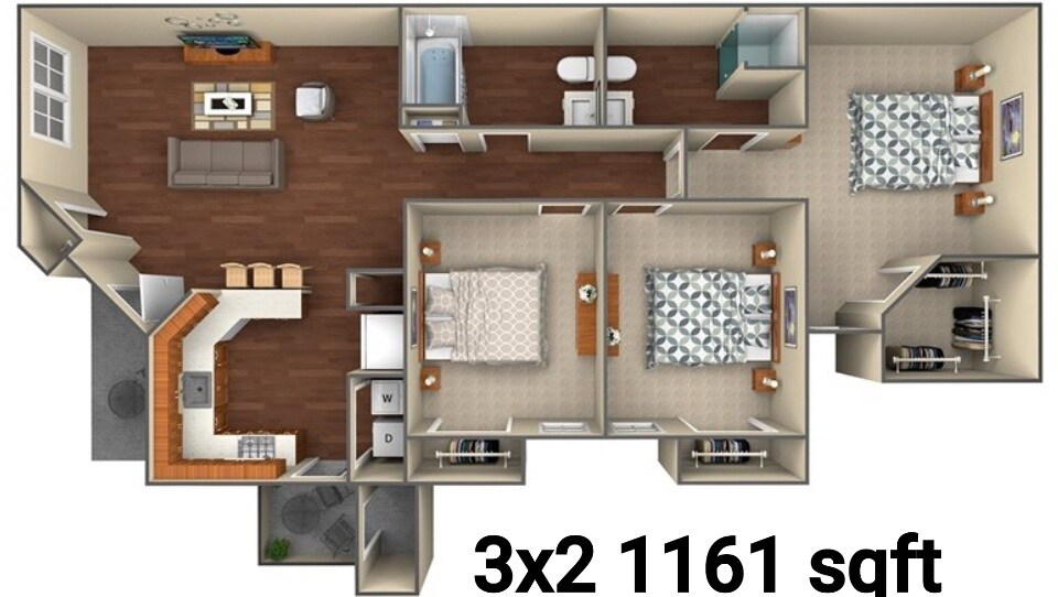 Modelo de apartamento: 3 BedroomDesde $7963 Dormitorios, 2 Baños, 1161 sq ftDisponible Ahora3 Bedroom - Plano 1