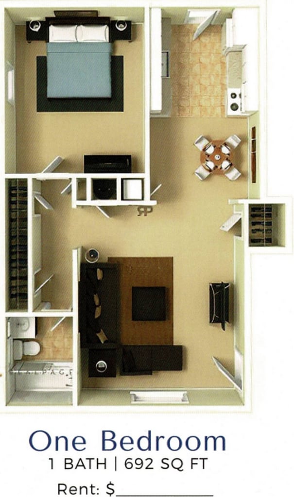 1 Dormitorio, 1 Baño, 692 pies²Disponible AhoraGalería del Modelo