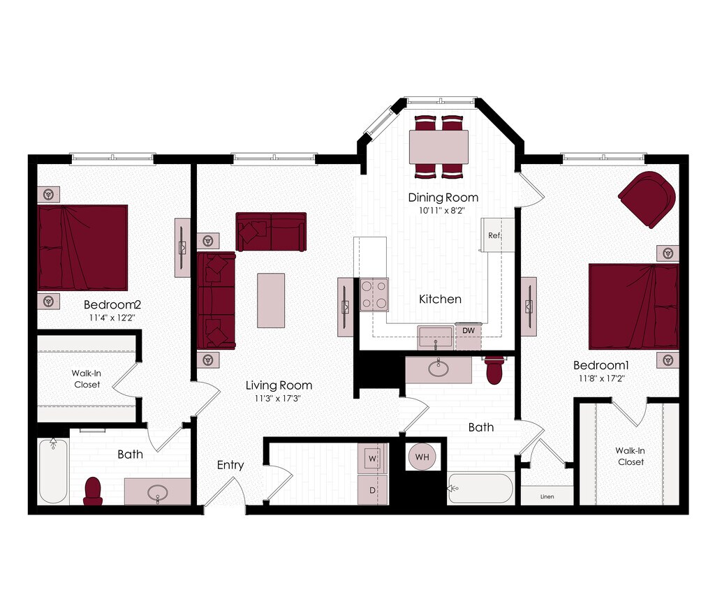 Modelo de apartamento: A2Desde $1,0931 Dormitorio, 1 Baño, 1003 sq ftDisponible Ahora![]()