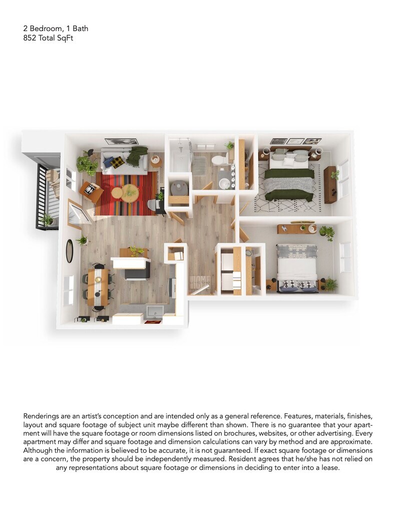 Modelo de apartamento: Two Bedroom One Bath Luxury2 Dormitorios, 1 Baño, 852 sq ftDisponible AhoraLos planos de la planta son una interpretación artística. Todas las dimensiones son aproximadas. Los tamaños o el detalle del producto real y sus especificaciones pueden variar. No todas las características están disponibles en todos los hogares para rentar. Los precios y la disponibilidad están sujetos a cambios. El alquiler que se muestra es mensual. Se pueden aplicar ciertos cargos, por ejemplo, entrega de paquetes, recolección de basura, agua, servicios, etc. Depositos varian. Consulta a un representante para conocer detalles.