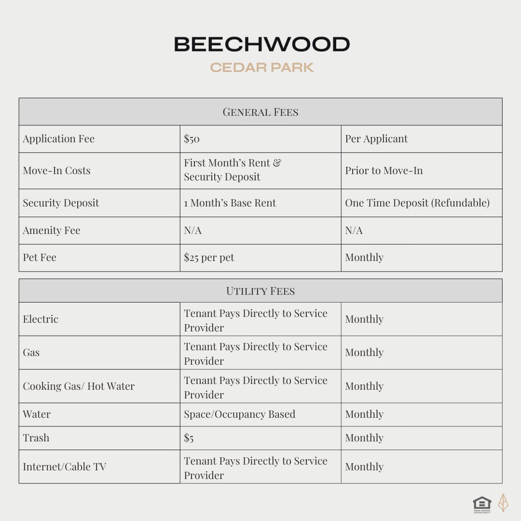 Las tarifas que se indican a continuación son proporcionadas por la comunidad y pueden excluir servicios públicos o complementos. Todos los pagos se realizan directamente a la propiedad y no son reembolsables, salvo que se especifique lo contrario.