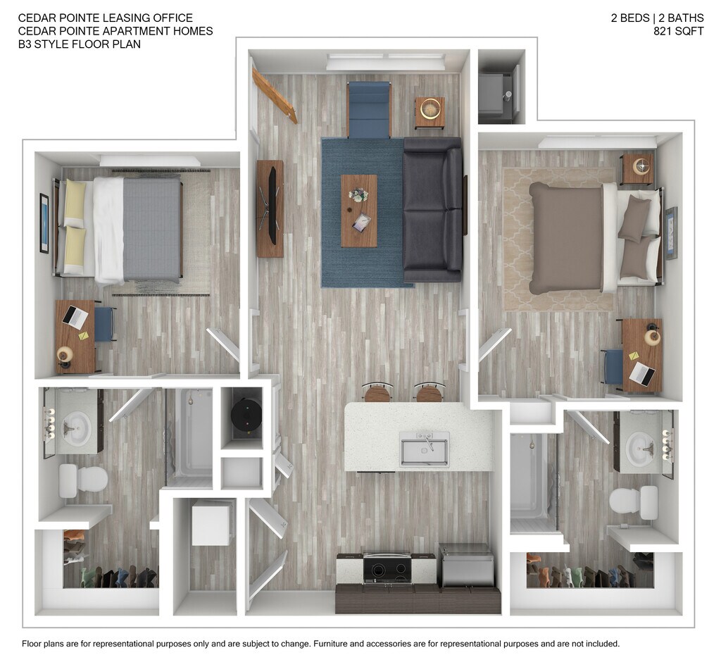Modelo de apartamento: B3$1,8802 Dormitorios, 2 Baños, 821 sq ftDisponible August 1, 2026![]()