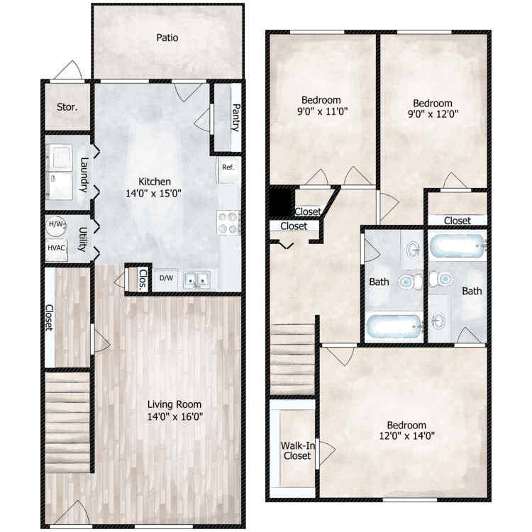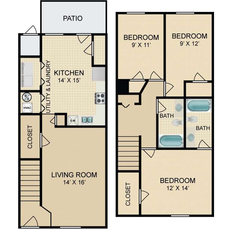 Modelo de apartamento: 3 Bedroom 2 Bath Townhome3 Dormitorios, 2 Baños, 1309 sq ftDisponible Ahora![]()