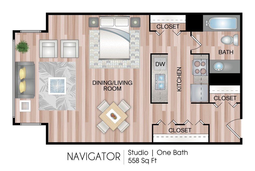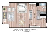 Modelo de apartamento: NavigatorLlame para PreciosEstudio, 1 Baño, 545-570 sq ftDisponible Ahora![]()