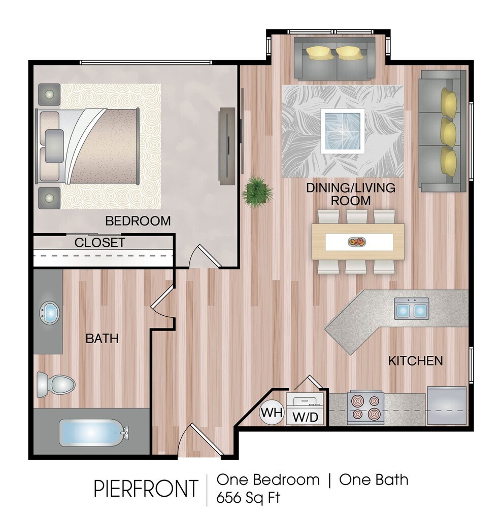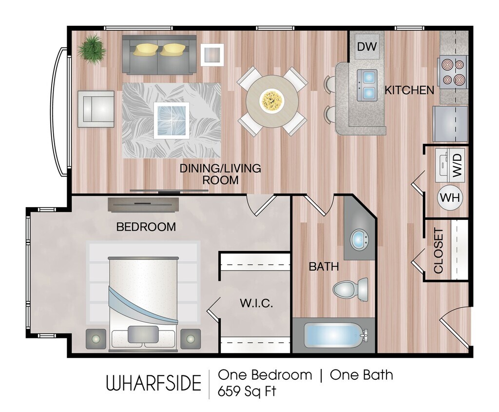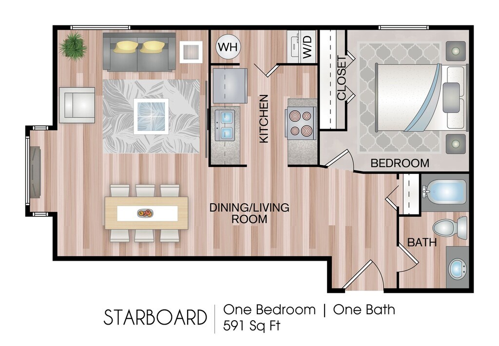 Wharfside - Plano 1 Unidad de apartamento: 01-20633Modelo de apartamento: WharfsideLlame para Precios1 Dormitorio, 1 Baño, 659 sq ftDisponible January 27, 2026Starboard