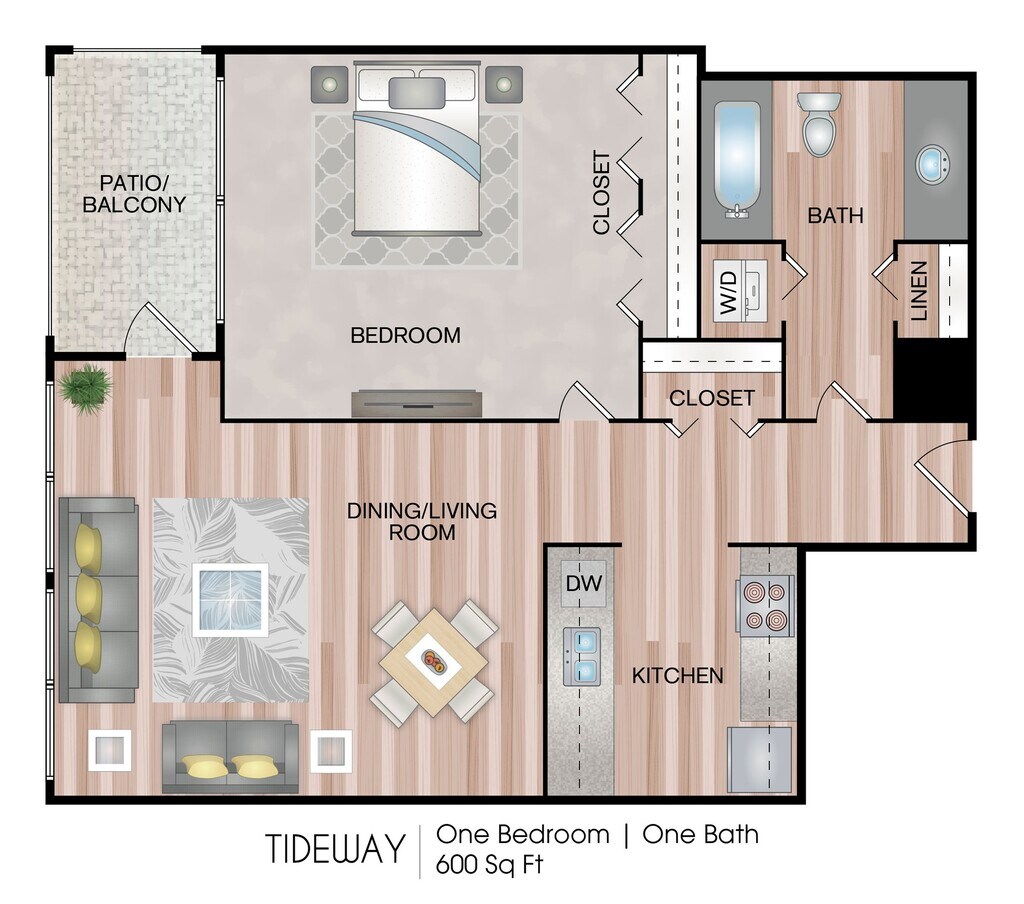Tideway - Plano 1 Unidad de apartamento: 01-12306Modelo de apartamento: TidewayLlame para Precios1 Dormitorio, 1 Baño, 600 sq ftDisponible AhoraHarborside