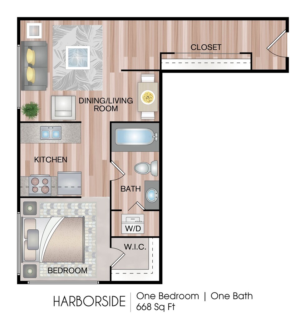 Modelo de apartamento: HarborsideLlame para Precios1 Dormitorio, 1 Baño, 668 sq ftDisponible Ahora![]()