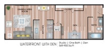 Waterfront with Den - Plano 1 Unidad de apartamento: 02-20209Modelo de apartamento: Waterfront with DenDesde $1,625Estudio, 1 Baño, 723 sq ftDisponible February 21, 2026Compass