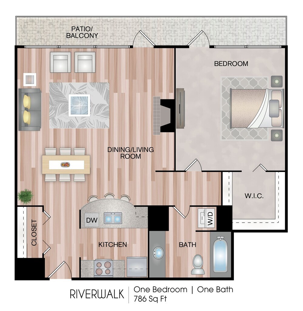 Modelo de apartamento: RiverwalkLlame para Precios1 Dormitorio, 1 Baño, 786 sq ftNo Disponible![]()