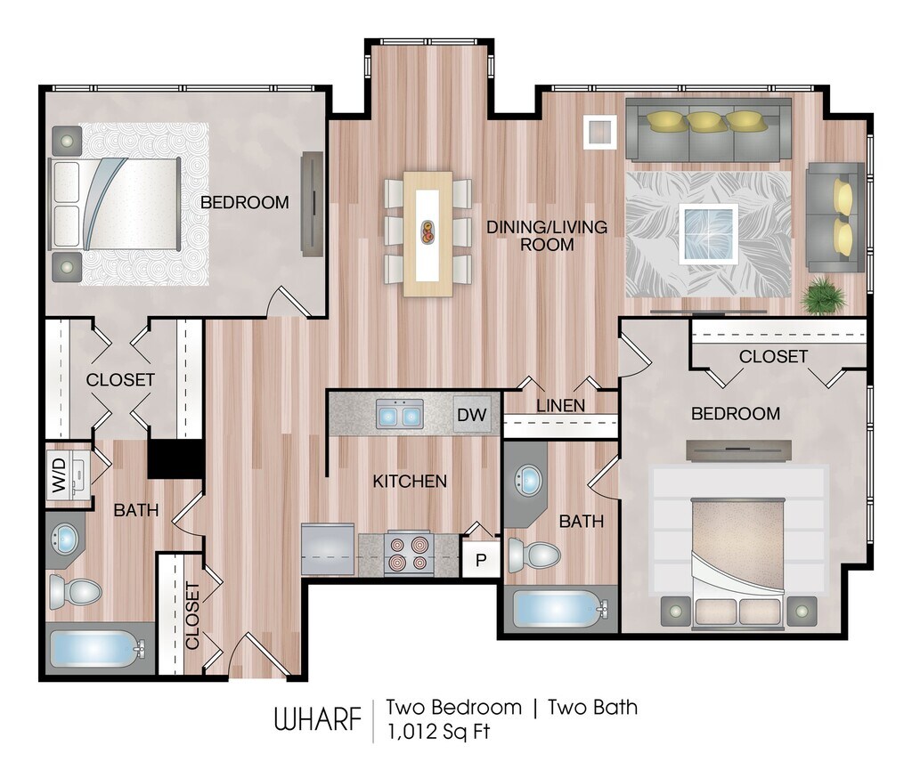 Modelo de apartamento: WharfLlame para Precios2 Dormitorios, 2 Baños, 1012 sq ftDisponible Ahora![]()