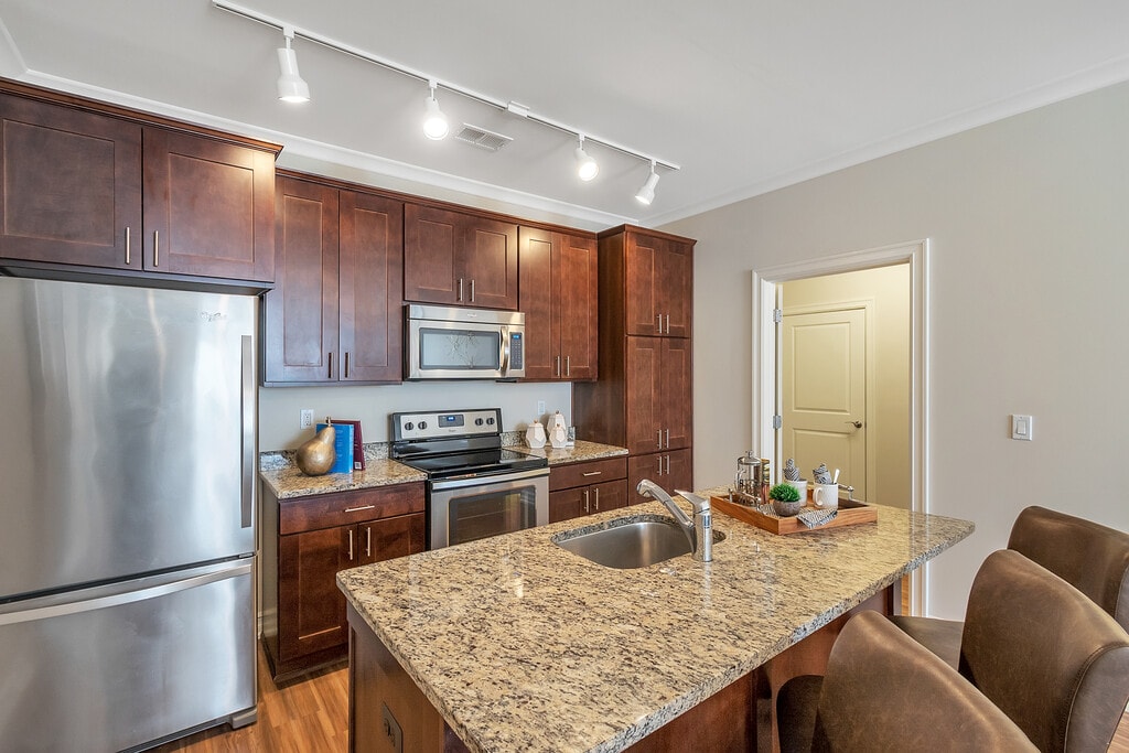 - Gabinetes de madera distintivos con herrajes de acero inoxidable