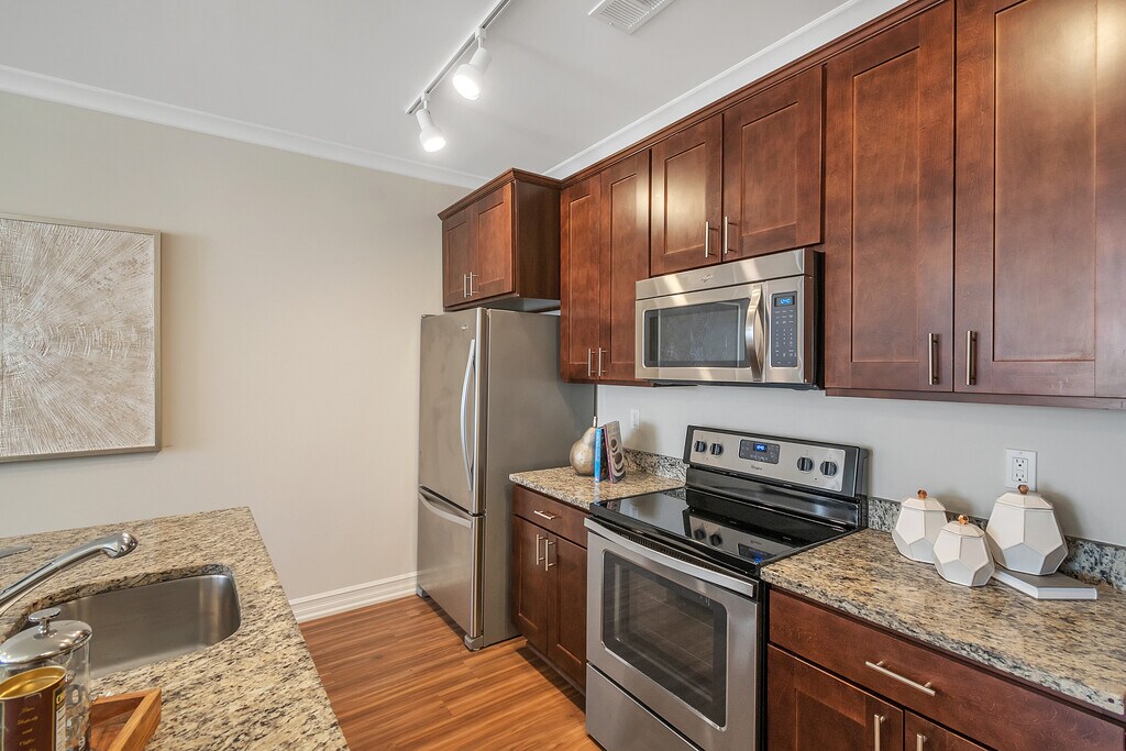 - Elegantes encimeras de granito en la cocina y los baños
