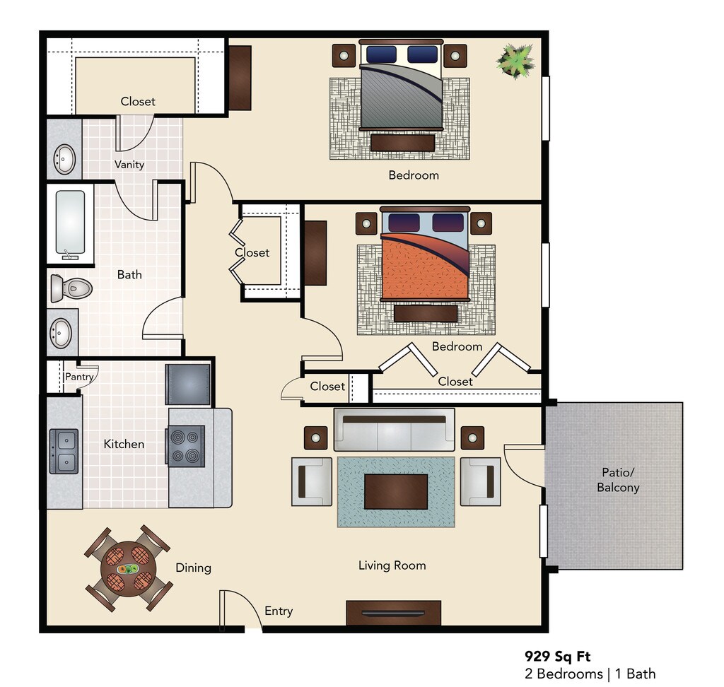 2 Dormitorios, 1 Baño, 929 pies²Disponible February 13, 2026Galería del Modelo