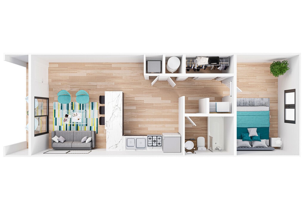 1 Dormitorio, 1 Baño, 550 pies²Disponible AhoraGalería del Modelo