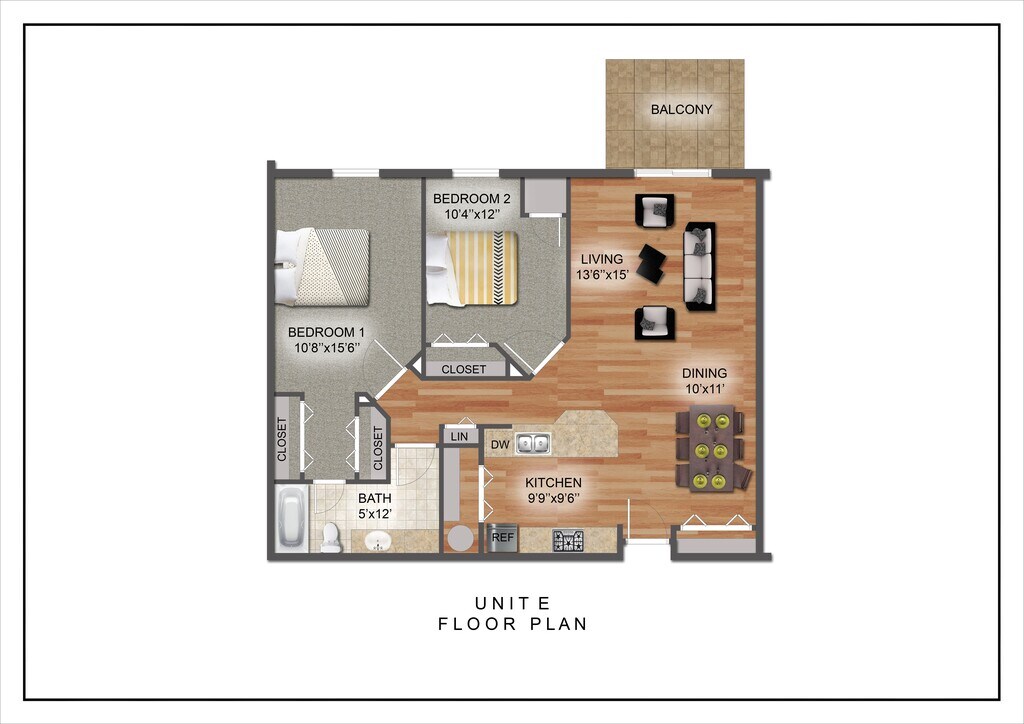 Two Bedroom Style B - Plano 1 Unidad de apartamento: 105Modelo de apartamento: Two Bedroom Style B$1,5002 Dormitorios, 2 Baños, 1054 sq ftDisponible April 11, 2026Two Bedroom Style E