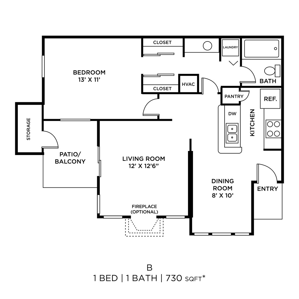 1 Dormitorio, 1 Baño, 730 pies²Disponible AhoraGalería del Modelo