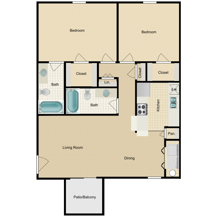 2 Dormitorios, 1 Baño, 860 pies²Disponible AhoraGalería del Modelo