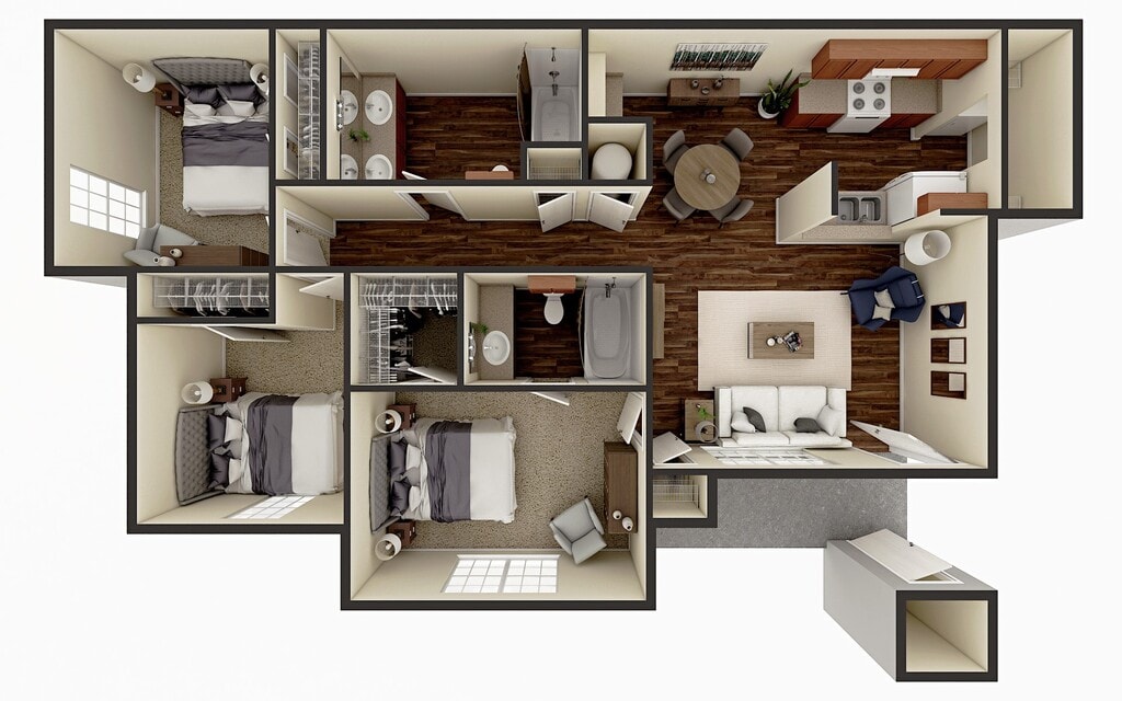 Modelo de apartamento: 3 Bedrooms$1,5003 Dormitorios, 2 Baños, 1090 sq ftDisponible Ahora![]()