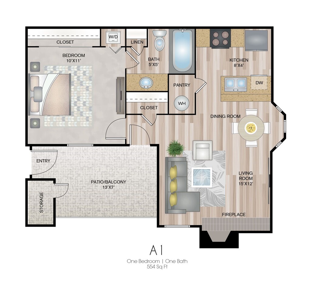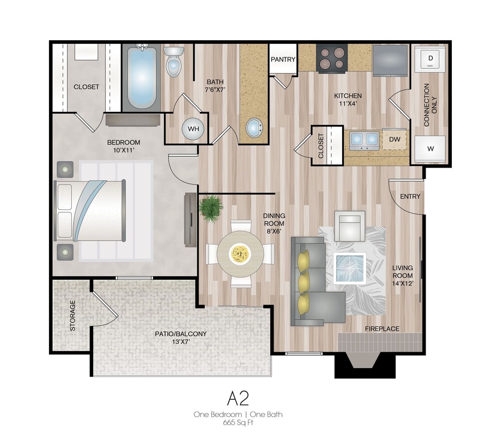 Modelo de apartamento: A2Desde $1,0591 Dormitorio, 1 Baño, 665 sq ftDisponible Ahora![]()