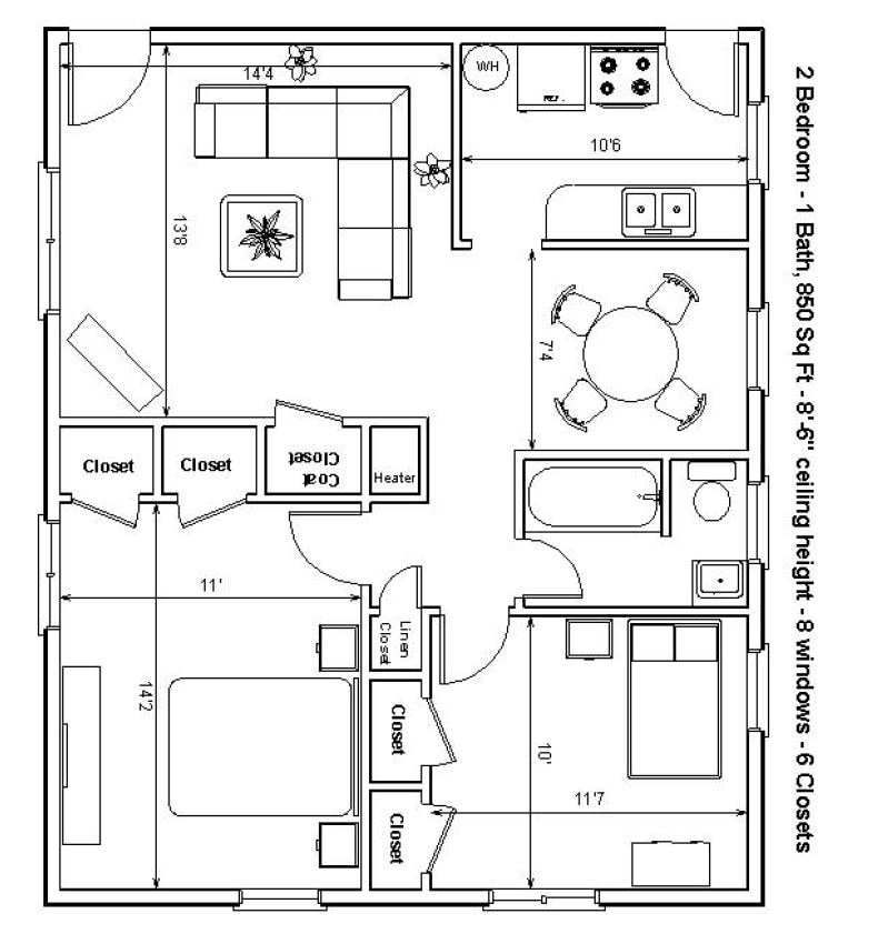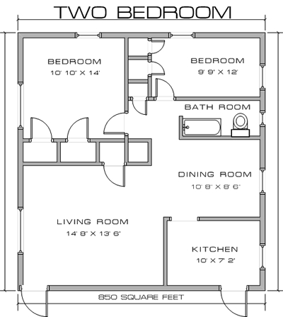2 Dormitorios, 1 Baño, 850 pies²Galería del Modelo