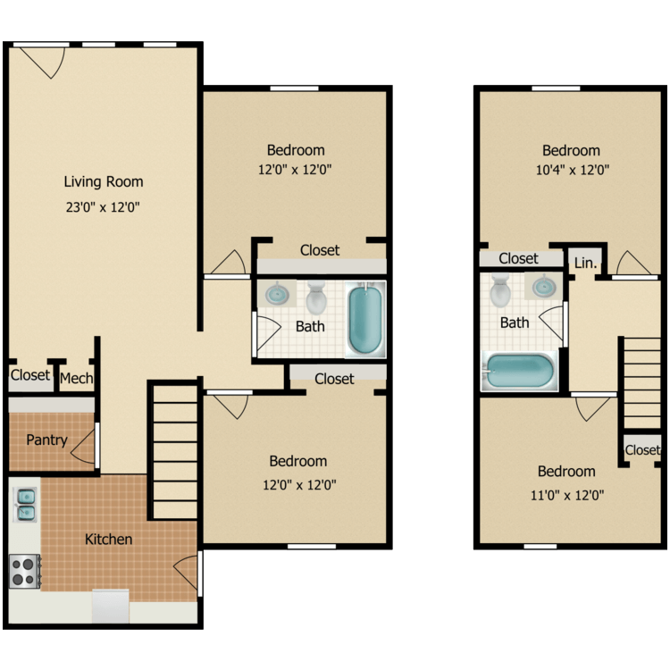 Modelo de apartamento: Four Bedroom Townhome4 Dormitorios, 2 Baños, 1285 sq ftNo Disponible![]()