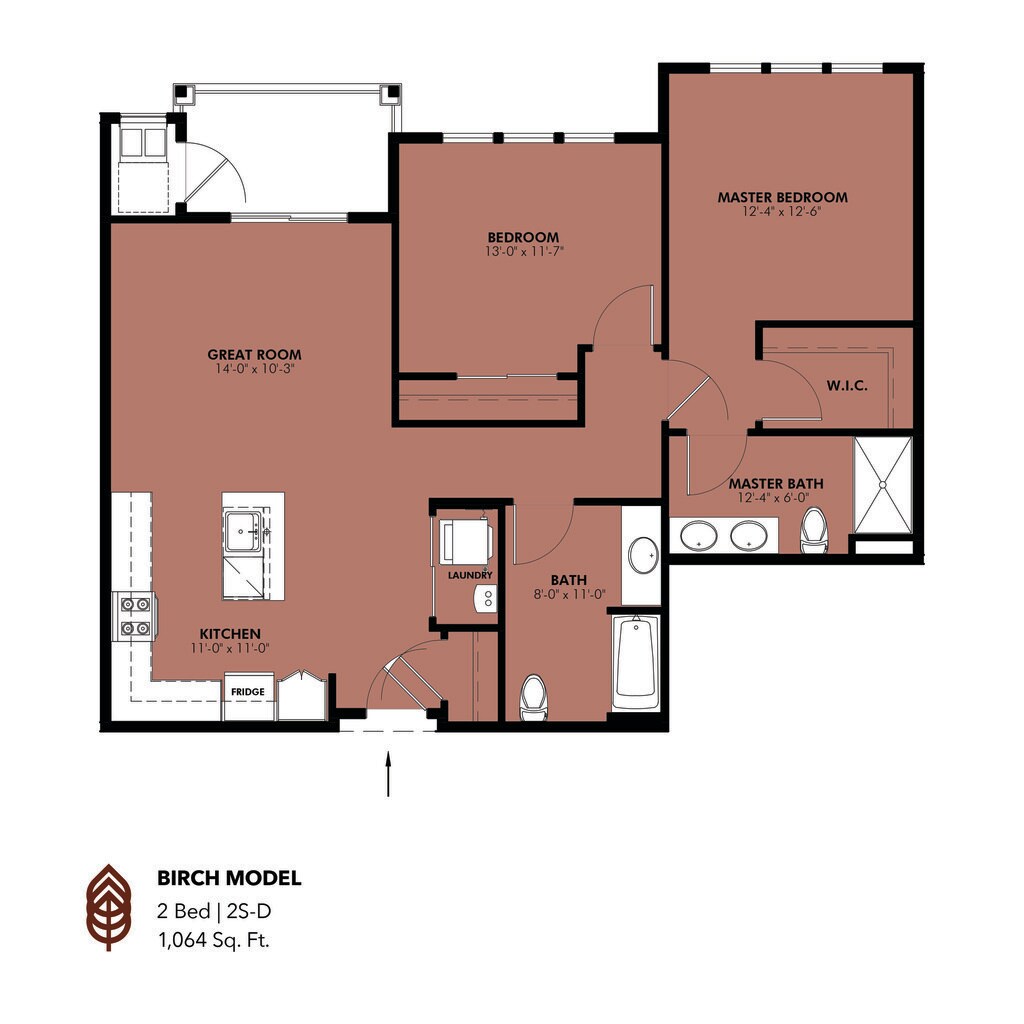 Modelo de apartamento: Birch Model$2,3172 Dormitorios, 2 Baños, 1064 sq ftDisponible AhoraBirch Model - Plano 1 Oak Model