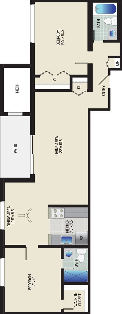 1 Bedroom + 1 Bath - Plano 13 2 Dormitorios