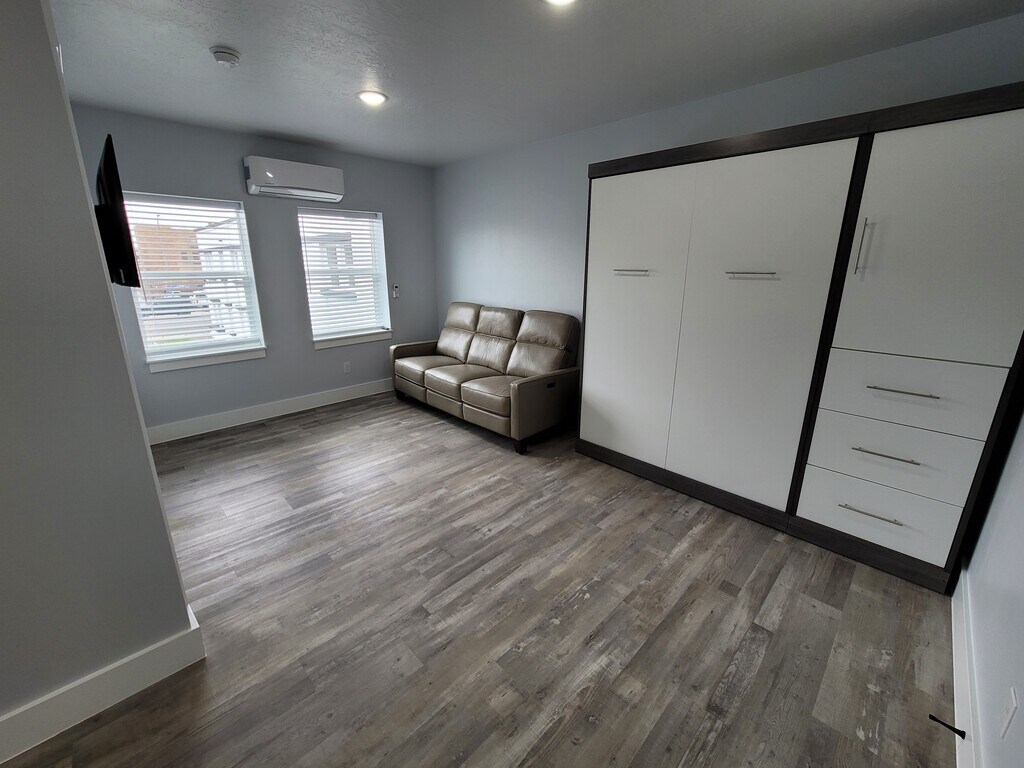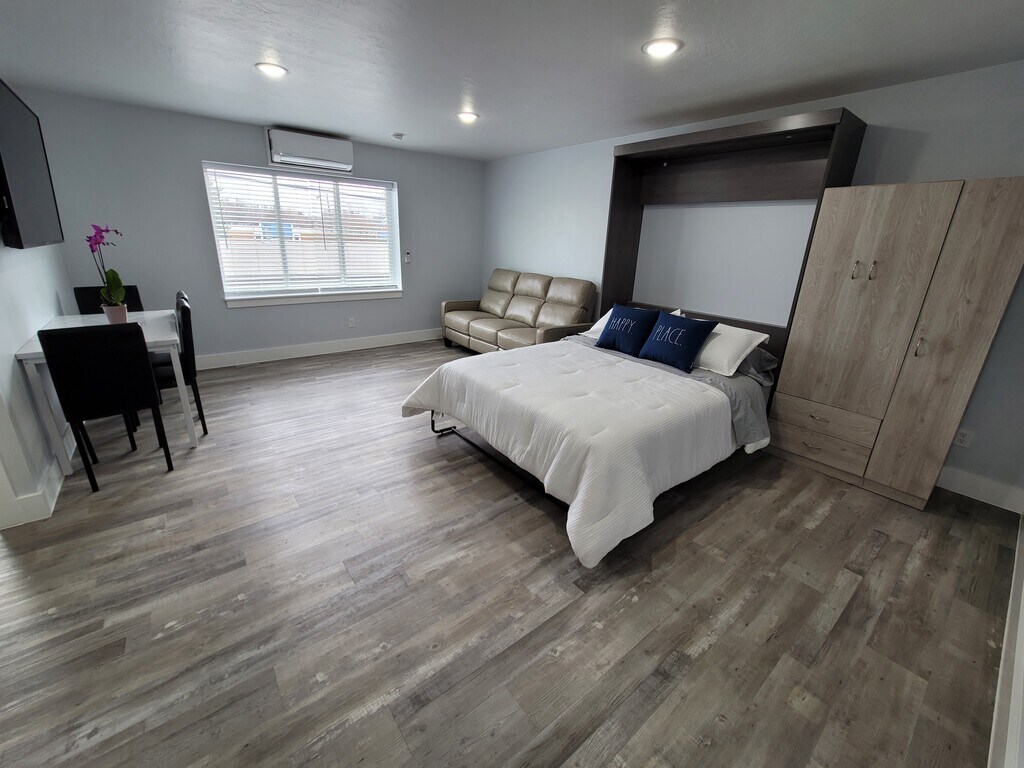 ¡Bienvenido a los apartamentos Chicane en Riverwalk! ¡Listo para la mudanza ahora! Los Chicane Apartments at the Riverwalk son una comunidad de apartamentos recientemente renovada que ofrece un estudio retromoderno y apartamentos de un dormitorio. Cada apartamento está equipado con una amplia variedad de comodidades de lujo. Todos los apartamentos tipo estudio y los apartamentos de un dormitorio están completamente equipados con un sofá reclinable eléctrico de cuero con reposacabezas ajustable, colchón de alta gama, base de resortes y marco de cama, televisor de alta definición 4K con pantalla plana grande, mesa y sillas de comedor. Disfruta de lujosos techos de 9 pies de altura, una gran cantidad de luz natural a través de ventanas nuevas, cabezales de ducha tipo lluvia, grifos de cocina extensibles, ventiladores de techo en las habitaciones, estantes empotrados en armarios, iluminación en armarios, accesorios modernos y muchos más acabados lujosos. Cada detalle se pensó en la instalación de luces LED, ventanas de doble panel de bajo consumo, electrodomésticos de bajo consumo y calefacción y aire acondicionado de bajo consumo con control individual del apartamento, todo lo que contribuye a un descuento en los costos de los servicios públicos. Se instaló aislamiento en todas las paredes interiores para la amortiguación acústica en todo el edificio. Hay una instalación de lavandería en el lugar con lavadoras y secadoras comerciales que están disponibles para los inquilinos sin cargo. Cada apartamento también cuenta con un área de almacenaje de 5 x 6 pies en el lugar sin cargo adicional. Internet de alta velocidad incluida en el alquiler. Hay un sistema de seguridad de 9 cámaras con monitoreo las 24 horas instalado en la propiedad. Hay un lugar de estacionamiento dedicado para cada apartamento y la opción de reservar lugares de estacionamiento adicionales. Nuestros planos de planta constan de apartamentos tipo estudio y de una habitación en diferentes disposiciones, lo que proporciona opciones para garantizar el lugar perfecto para ti. Los Chicane Apartments at the Riverwalk están convenientemente ubicados a pasos del centro de Idaho Falls y a una cuadra del hermoso Riverwalk Park. Está ubicado a solo unas cuadras de distancia de varios excelentes restaurantes y bares, así como del centro recreativo de la ciudad. Las atracciones cercanas incluyen el Museo de Idaho, East Idaho Aquarium, Art Museum of Eastern Idaho, Idaho Falls Farmer's Market y la Idaho Falls Public Library. En el Chicane, seguramente disfrutará de lo mejor que la lujosa vida en el centro de la ciudad tiene para ofrecer.