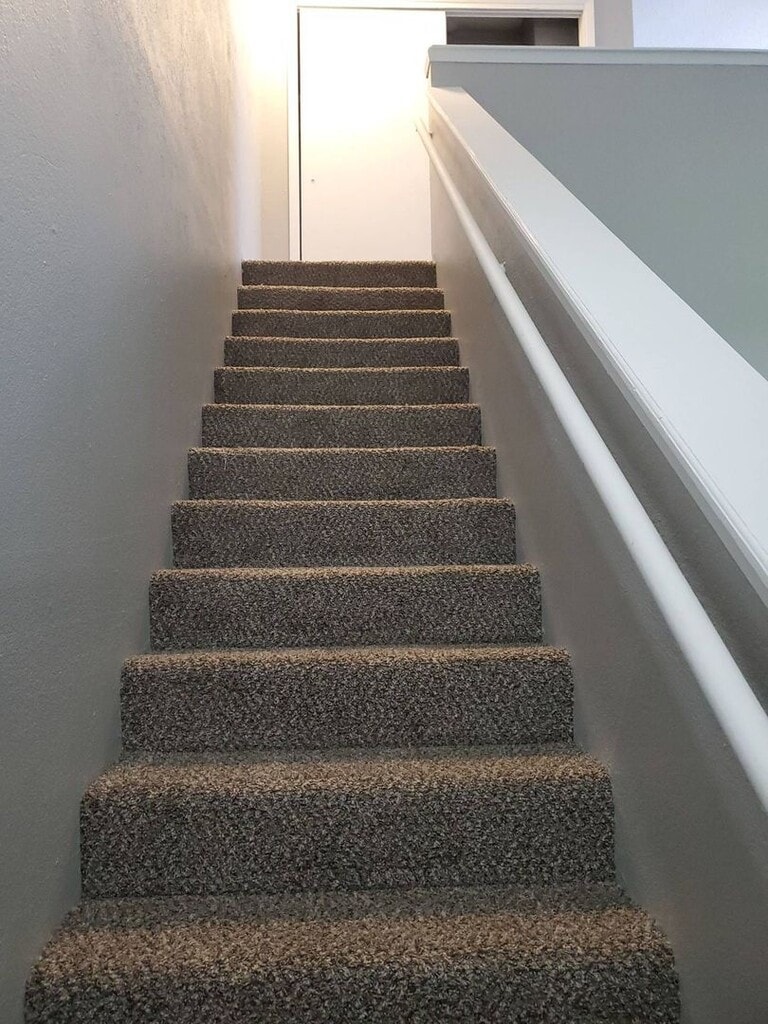 The apartment has 2 bedrooms , its a bilevel . The livingroom is off to the left of the entrance. The steps lead down to the dinning room on left