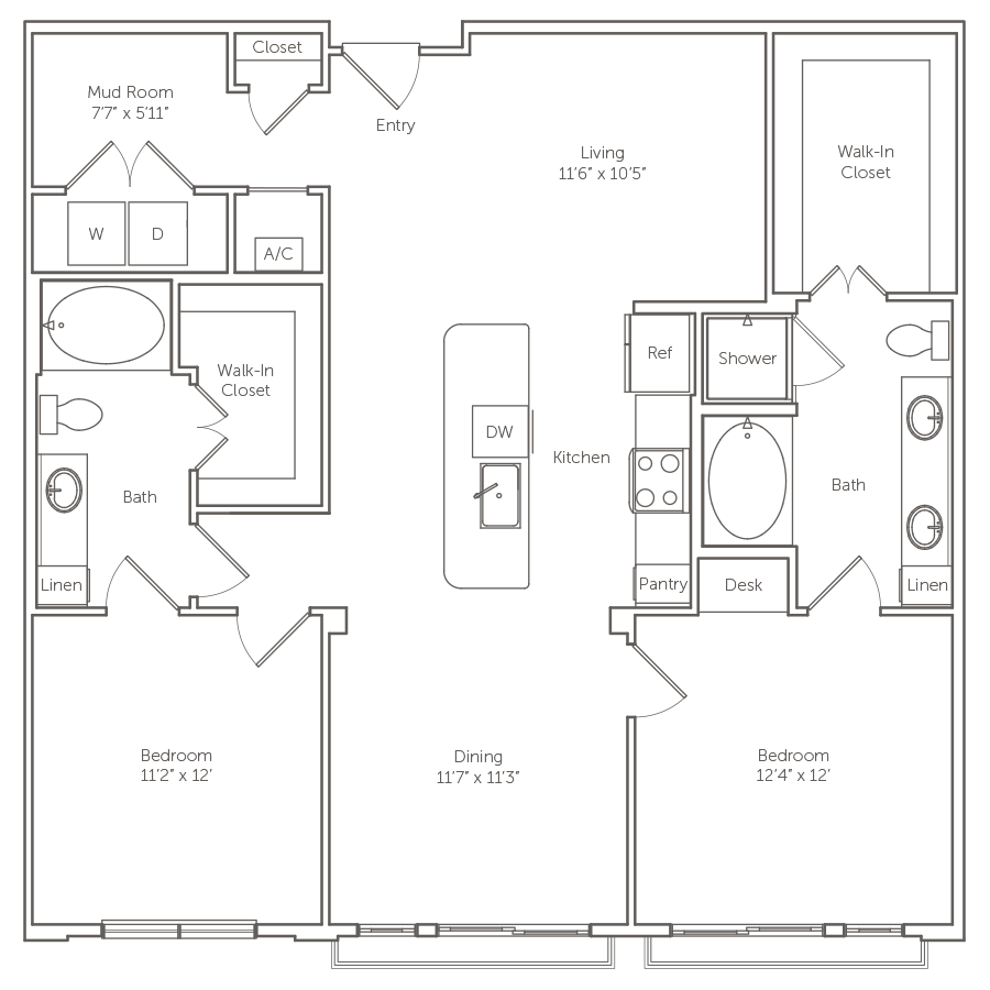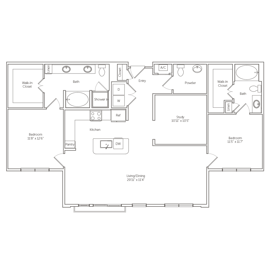 Modelo de apartamento: A2Desde $1,4751 Dormitorio, 1 Baño, 777-783 sq ftDisponible Ahora![]()