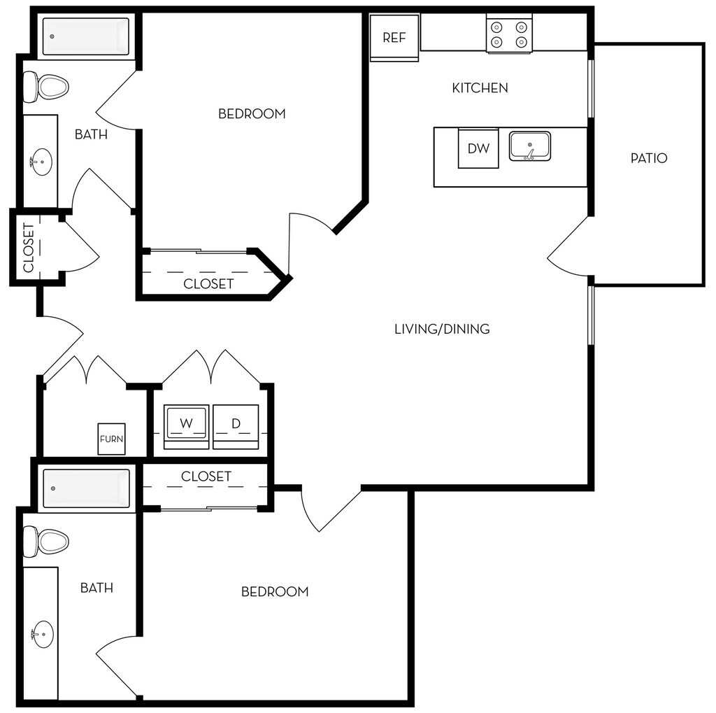 2 Dormitorios, 2 Baños, 1086 pies²El más grandeEsta opción tiene las unidades más grandes para este modeloGalería del Modelo