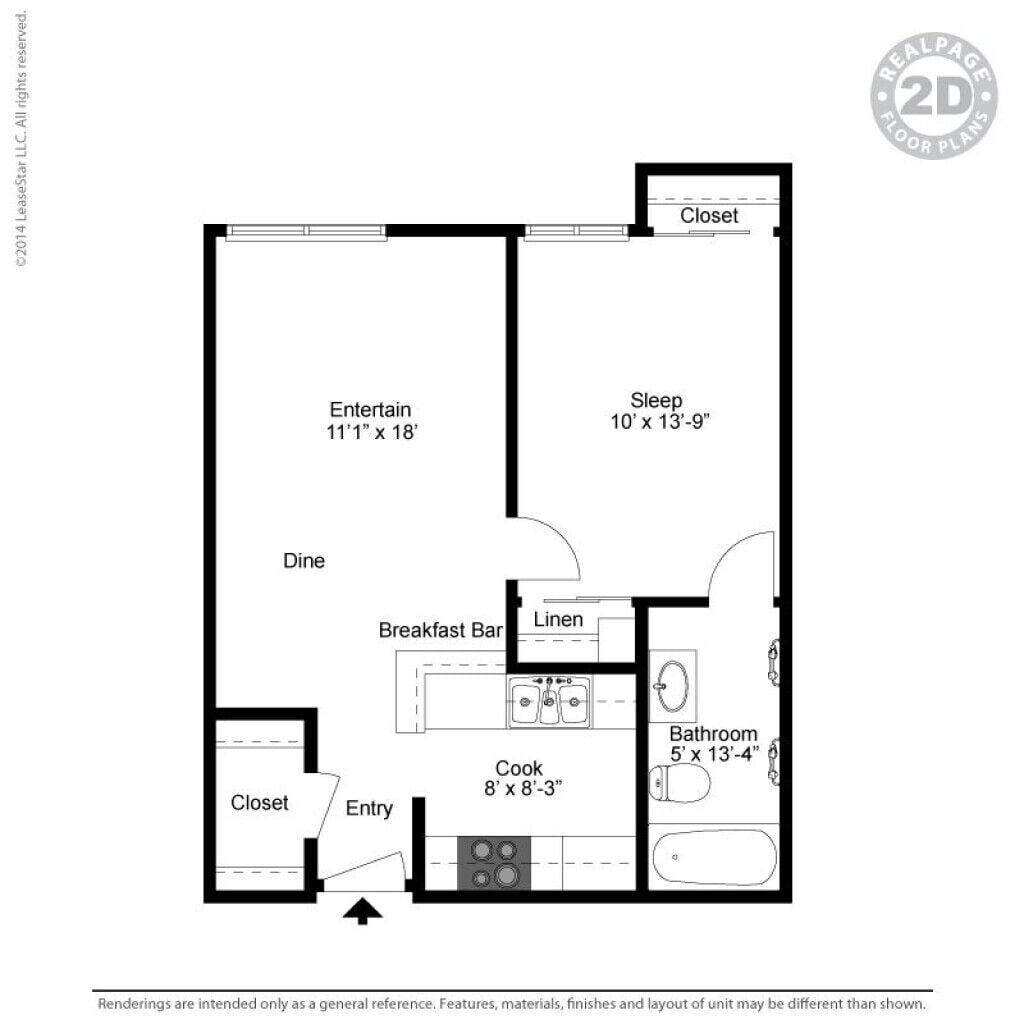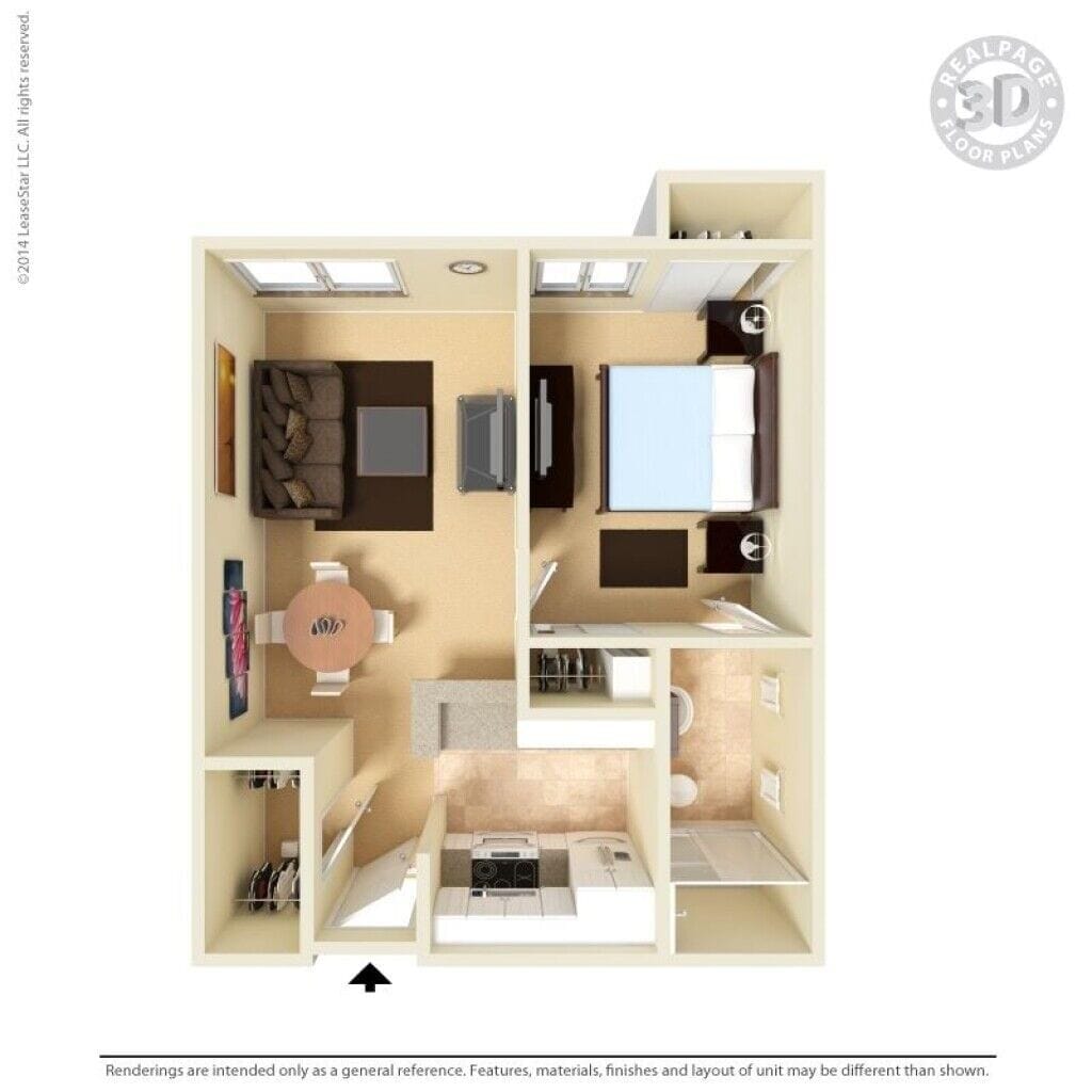 Medium 1 Bed 1 Bath - Plano 1 Los planos de la planta son una interpretación artística. Todas las dimensiones son aproximadas. Los tamaños o el detalle del producto real y sus especificaciones pueden variar. No todas las características están disponibles en todos los hogares para rentar. Los precios y la disponibilidad están sujetos a cambios. El alquiler que se muestra es mensual. Se pueden aplicar ciertos cargos, por ejemplo, entrega de paquetes, recolección de basura, agua, servicios, etc. Depositos varian. Consulta a un representante para conocer detalles.