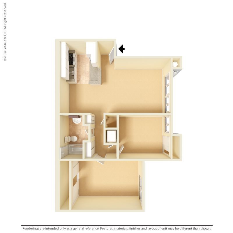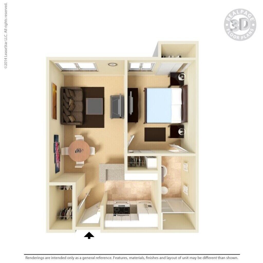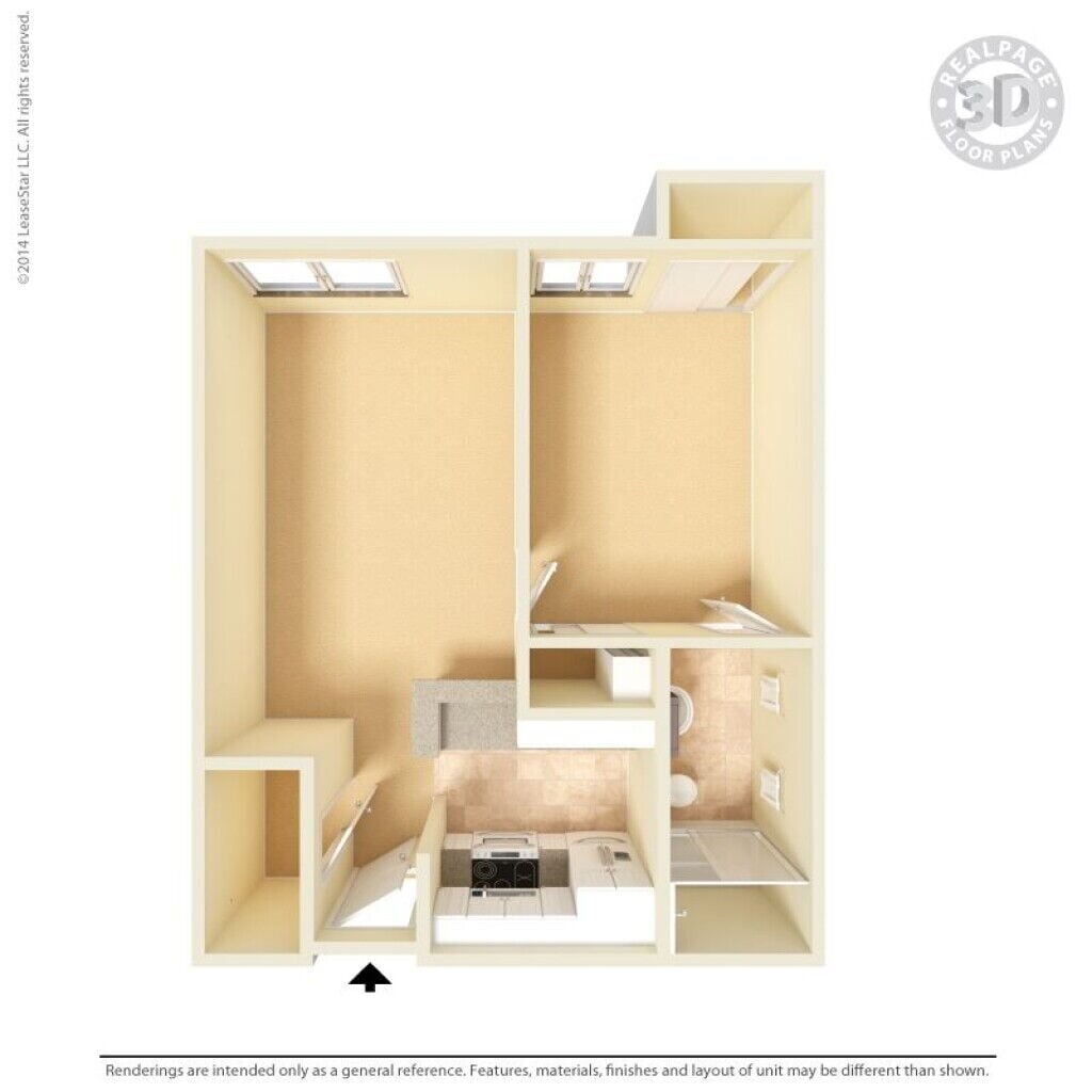 Medium 1 Bed 1 Bath - Plano 3 Los planos de la planta son una interpretación artística. Todas las dimensiones son aproximadas. Los tamaños o el detalle del producto real y sus especificaciones pueden variar. No todas las características están disponibles en todos los hogares para rentar. Los precios y la disponibilidad están sujetos a cambios. El alquiler que se muestra es mensual. Se pueden aplicar ciertos cargos, por ejemplo, entrega de paquetes, recolección de basura, agua, servicios, etc. Depositos varian. Consulta a un representante para conocer detalles.
