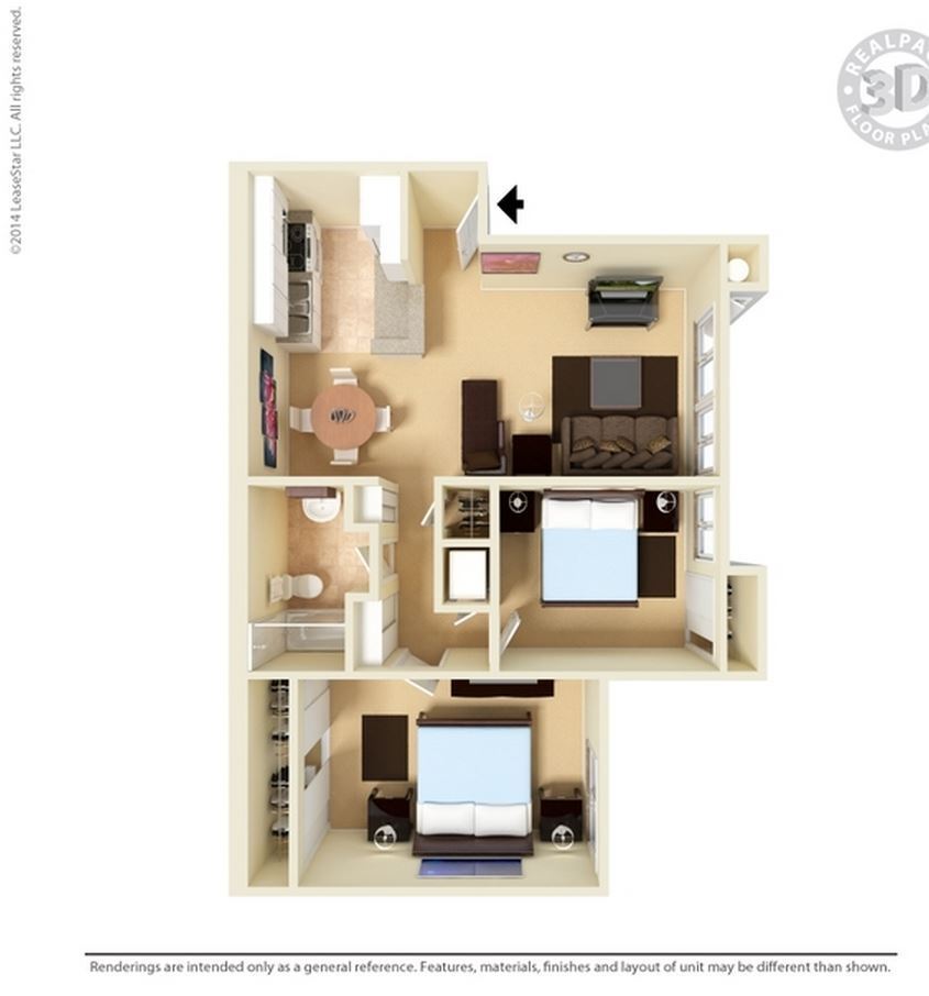 Medium 2 Bed 1 Bath - Plano 2 Los planos de la planta son una interpretación artística. Todas las dimensiones son aproximadas. Los tamaños o el detalle del producto real y sus especificaciones pueden variar. No todas las características están disponibles en todos los hogares para rentar. Los precios y la disponibilidad están sujetos a cambios. El alquiler que se muestra es mensual. Se pueden aplicar ciertos cargos, por ejemplo, entrega de paquetes, recolección de basura, agua, servicios, etc. Depositos varian. Consulta a un representante para conocer detalles.