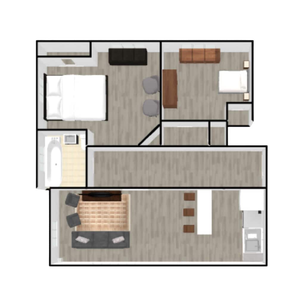 2 Dormitorios, 1 Baño, 823-1000 pies²Disponible AhoraGalería del Modelo