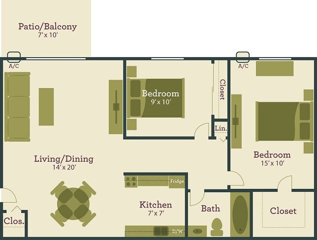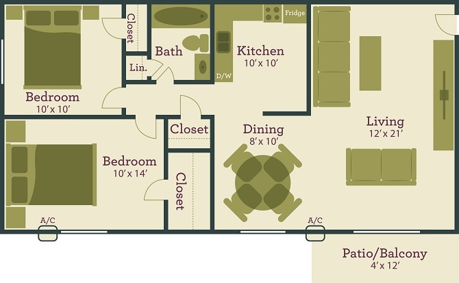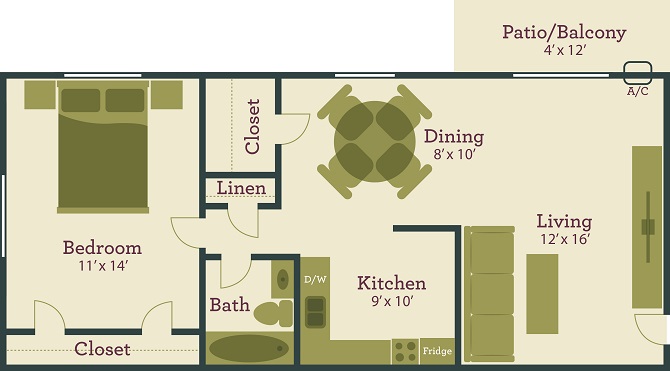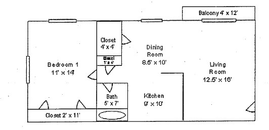 Modelo de apartamento: Two Bedroom A2 Dormitorios, 1 Baño, 740 sq ftNo Disponible![]()