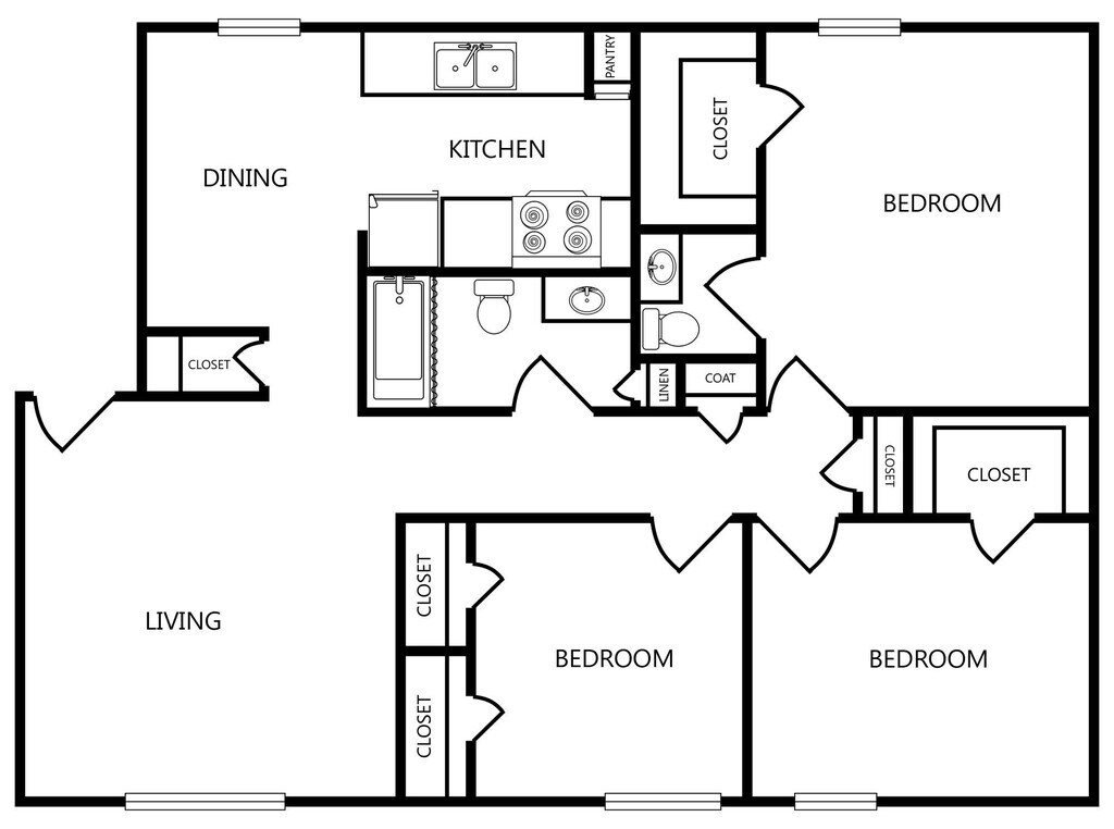 Modelo de apartamento: BHLlame para Precios2 Dormitorios, 1 Baño, 974 sq ftNo DisponibleBH - Plano 1 3 Dormitorios