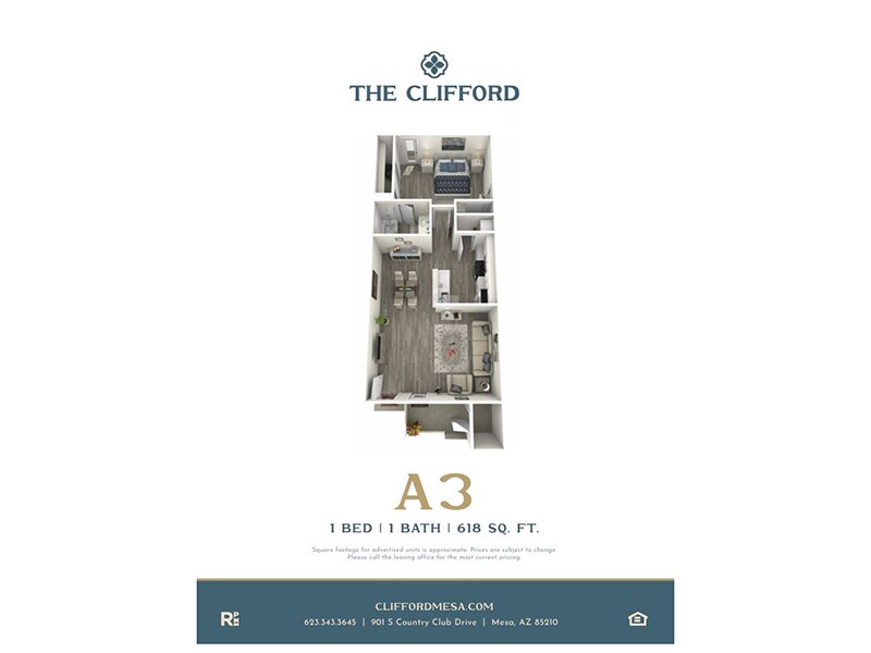 Modelo de apartamento: A3Desde $1,1441 Dormitorio, 1 Baño, 618 sq ftDisponible Ahora![]()